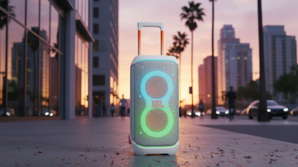 - Best overall party speaker (big sound + portability): JBL PartyBox Stage 320 – Portable Party Speaker with Telescopic Handle & Wide, Sturdy Wheels, Powerful JBL Pro Sound, Futuristic lightshow, Up to 18 Hours of Play time, Splash Proof (White)